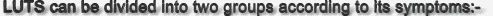 Those that occur during the filling of the bladder known as ‘storage symptoms’ and those that are present whilst urine is being passed are known as ‘voiding symptoms’