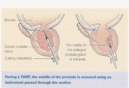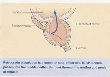 Retrograde Ejaculation – this occurs in nearly all men after TUR(P), i.e. rather than sperm being ejaculated out through the penis during sexual climax, the sperm pass back into the bladder and are passed out in the urine. This may reduce the ability to have children, but is NOT a means of contraception.